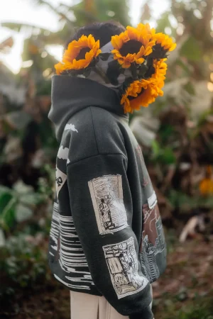 The front holds the soul of Vshey, where a swing hangs from branches that are slowly losing their leaves, reminding us of the same childhood tree where we once sat, played, and rested under its shade. Below, a pocket opens into a fragile memory: an old house stands quietly, the sky crossed with simple wires where birds sit in silence, and a kite flies above as time moves gently forward. Empty chairs hold a child whose eyes are covered not by darkness but by innocence, with a small flower resting on the blindfold as a symbol of pure hope. In front of the house, three children play a simple rope game, two turning the rope while a little girl jumps without fear, unaware that these ordinary moments will one day become memories we ache for. Above it all, a raised patch softly reminds us that somewhere deep inside, childhood still plays.